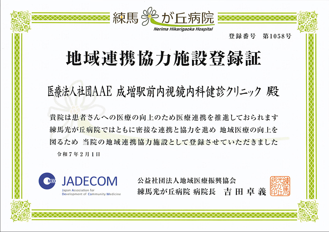 当院の人間ドックや内視鏡検査(胃カメラ・大腸カメラ)で、万が一、手術や入院を伴う精密検査・治療が必要な病変が見つかった場合、優先的に練馬光が丘病院へ紹介が可能です。 患者様がご自身で病院を探す不安を解消します。