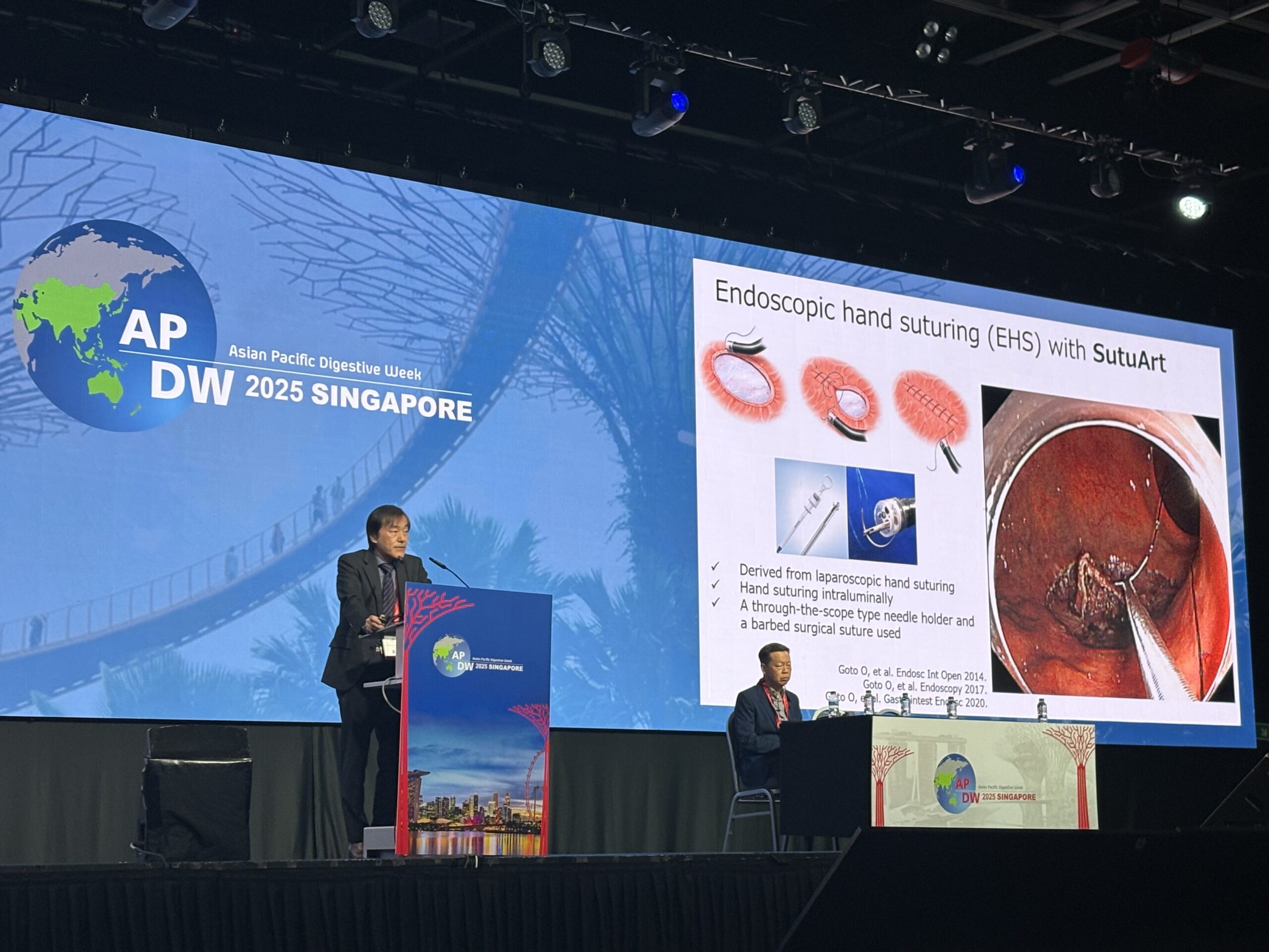 今回、後藤先生は日本最大の内視鏡機器メーカーが協賛するランチョンセミナーに講師として選ばれ、ご自身の研究テーマである「内視鏡的手縫い縫合法(Endoscopic hand suturing)」 についてご紹介されました。