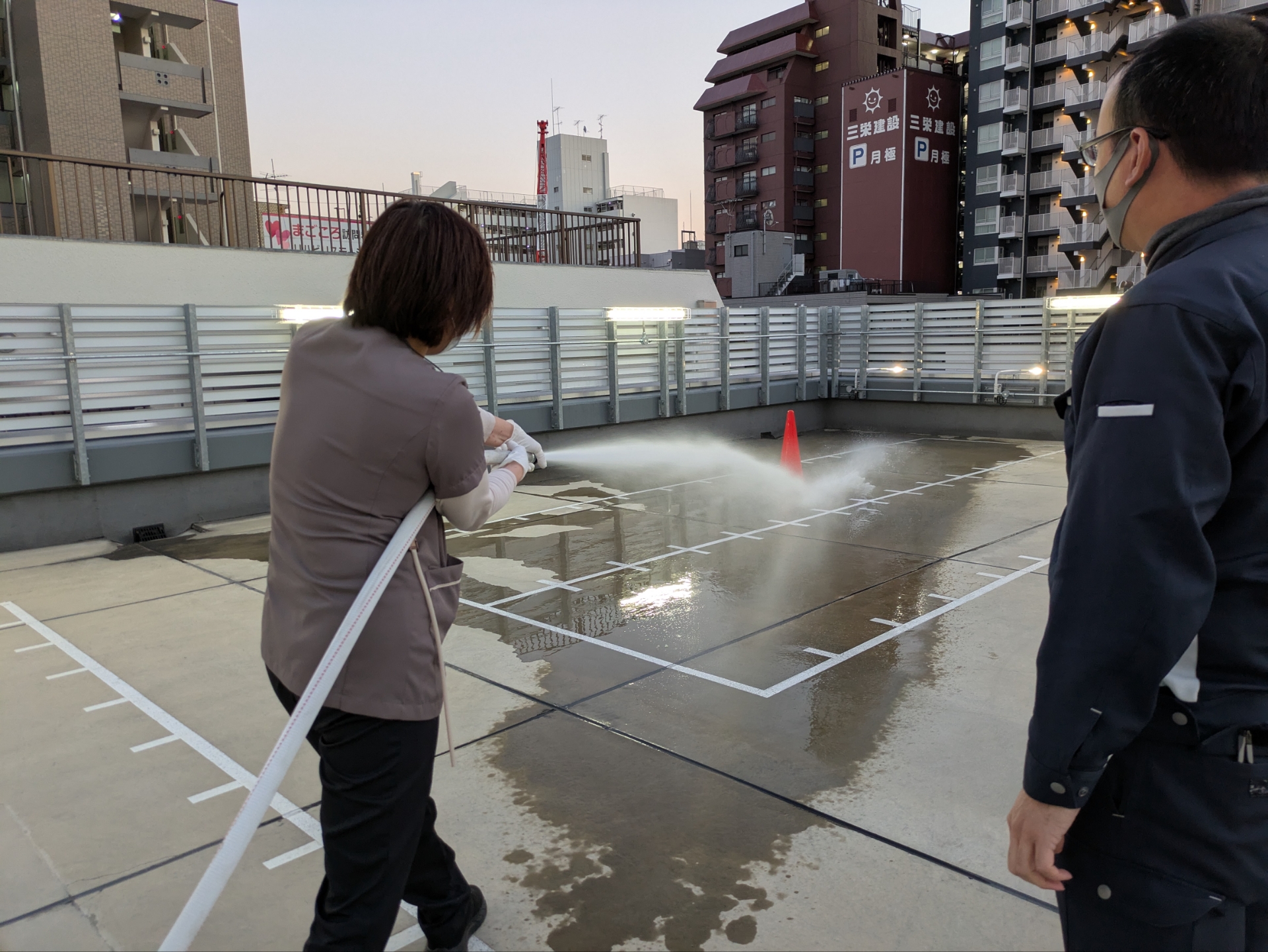 当院スタッフも参加して、消火器・消火用散水栓の使用方法の説明と実践、そして避難経路の確認を行いました。
