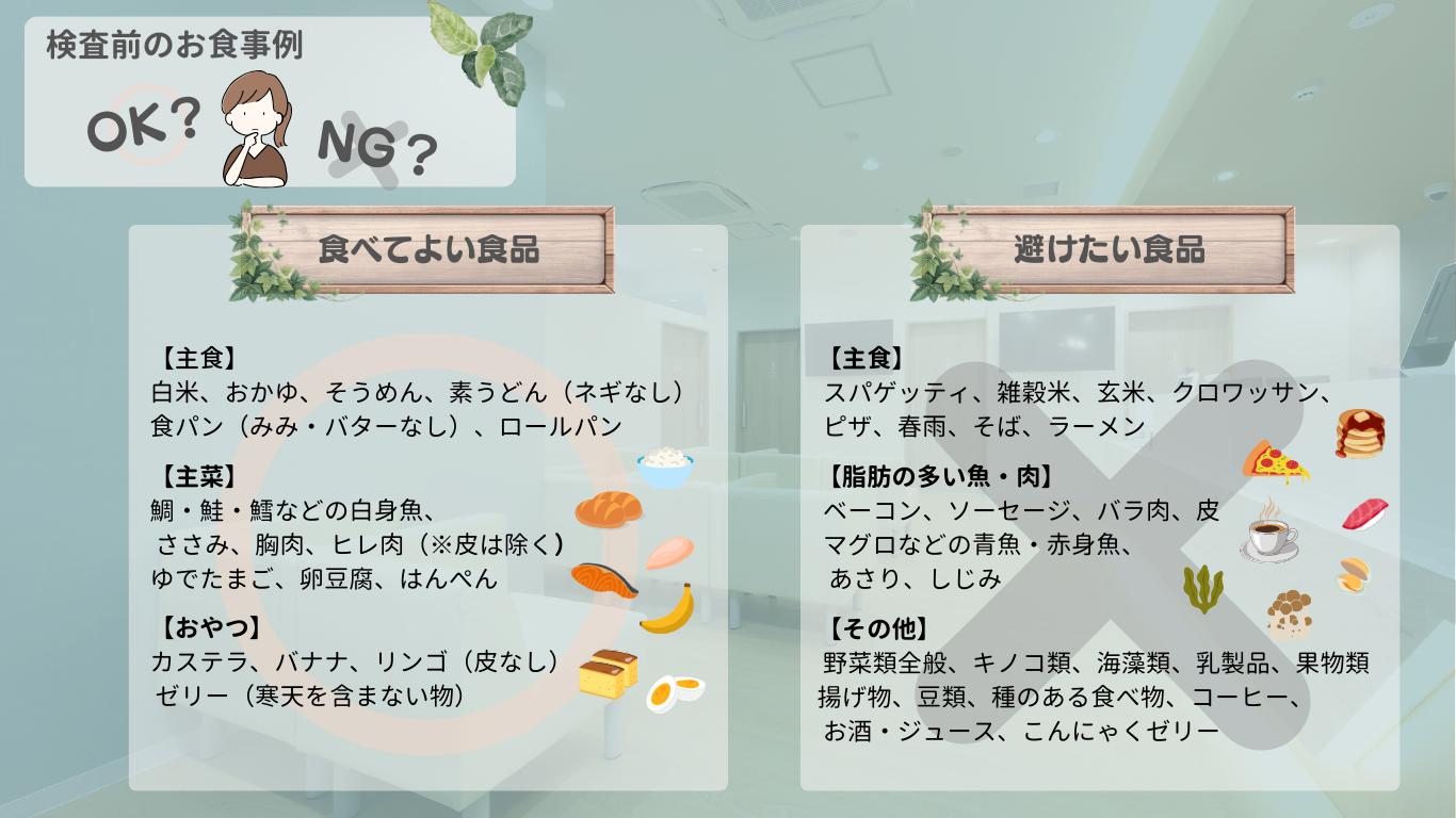 胃腸をきれいにしておくことが、検査をスムーズに、そして楽に受けるためのポイントです。腸内に食べカスが残っていると、確認に時間がかかり、結果として身体的・精神的な負担が増えてしまいます。