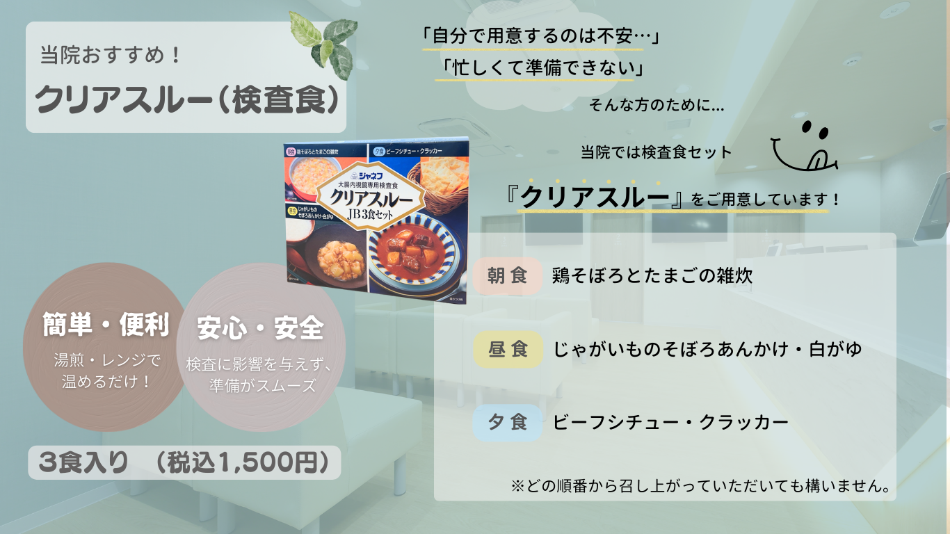 「自分で用意するのは不安」「忙しくて準備できない」という方のために、当院では検査食セット『クリアスルー』をご用意しています。