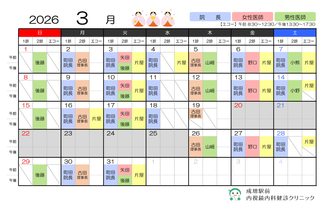 2026年3月の医師の勤務日及びエコー実施日は次の通りです。