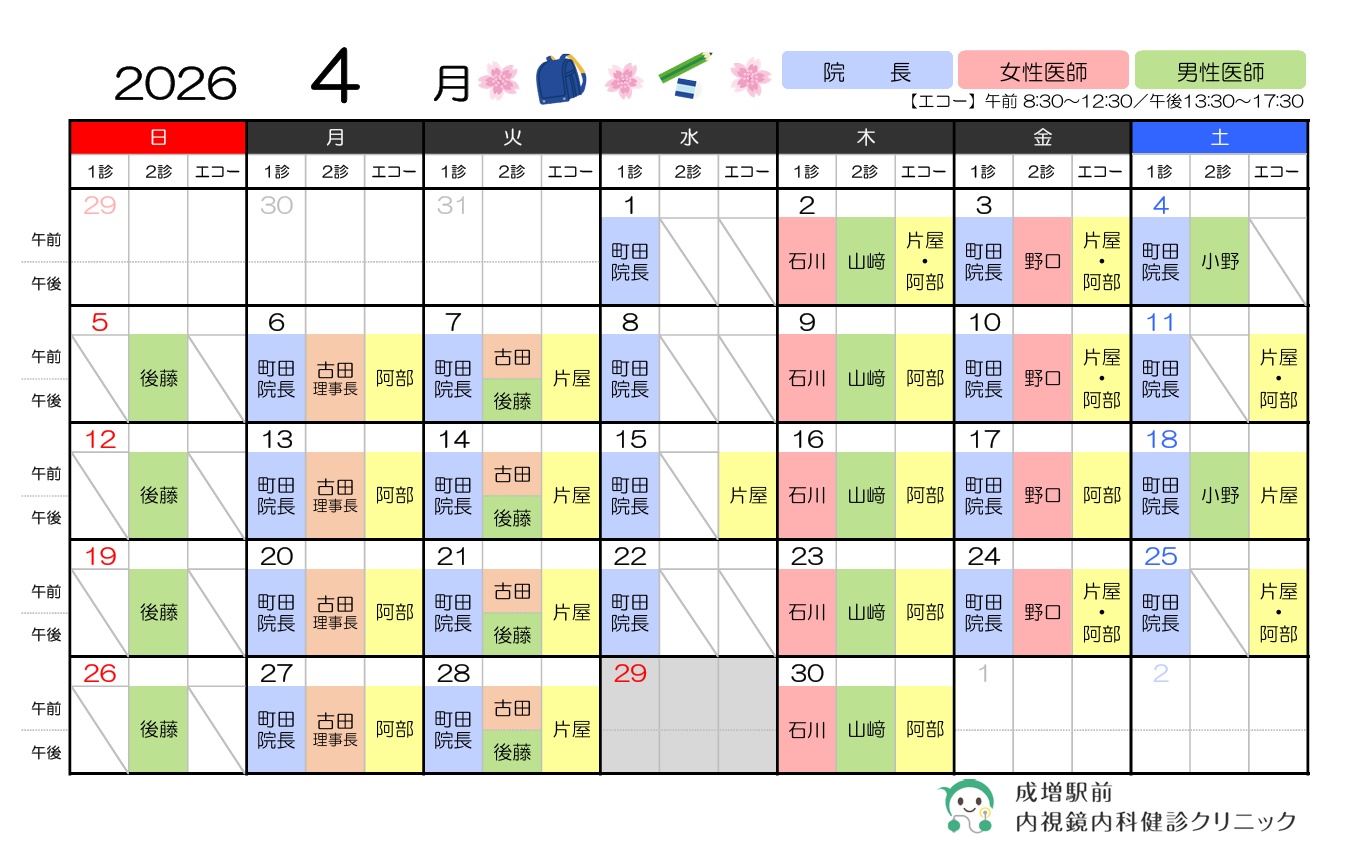2026年4月の医師の勤務日及びエコー実施日は次の通りです。