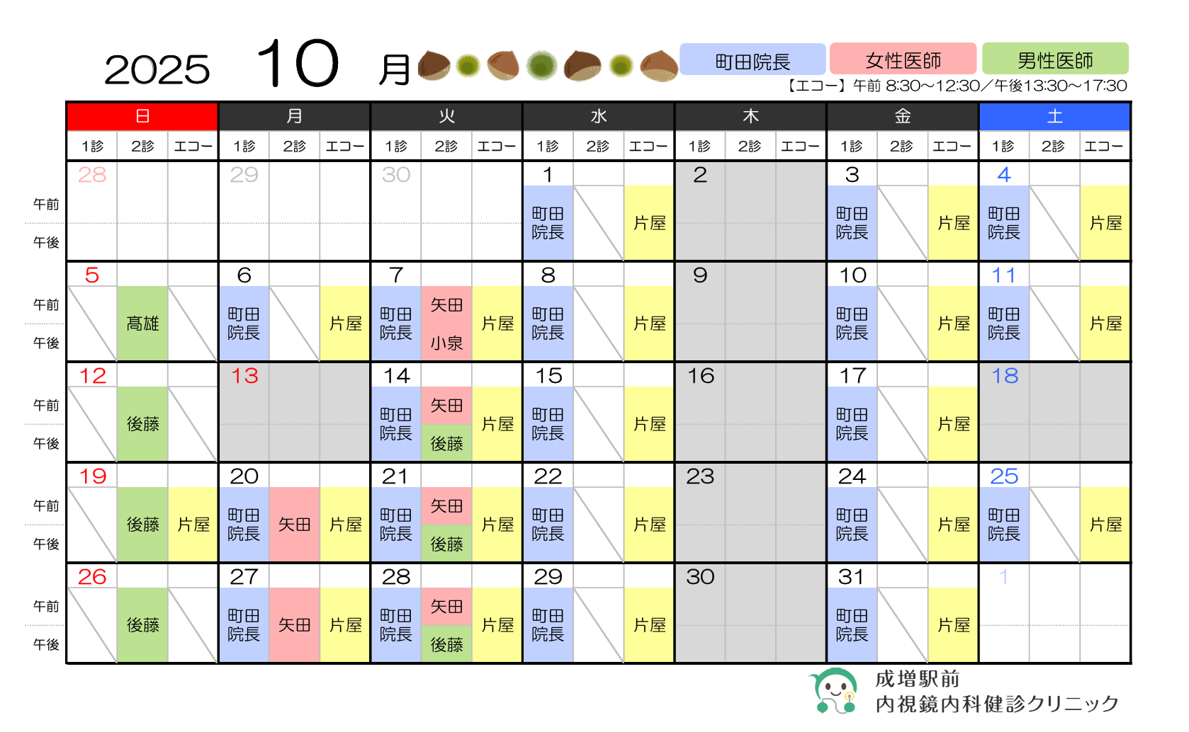 2025年10月の医師の勤務日及び、エコー実施日は以下の通りです。