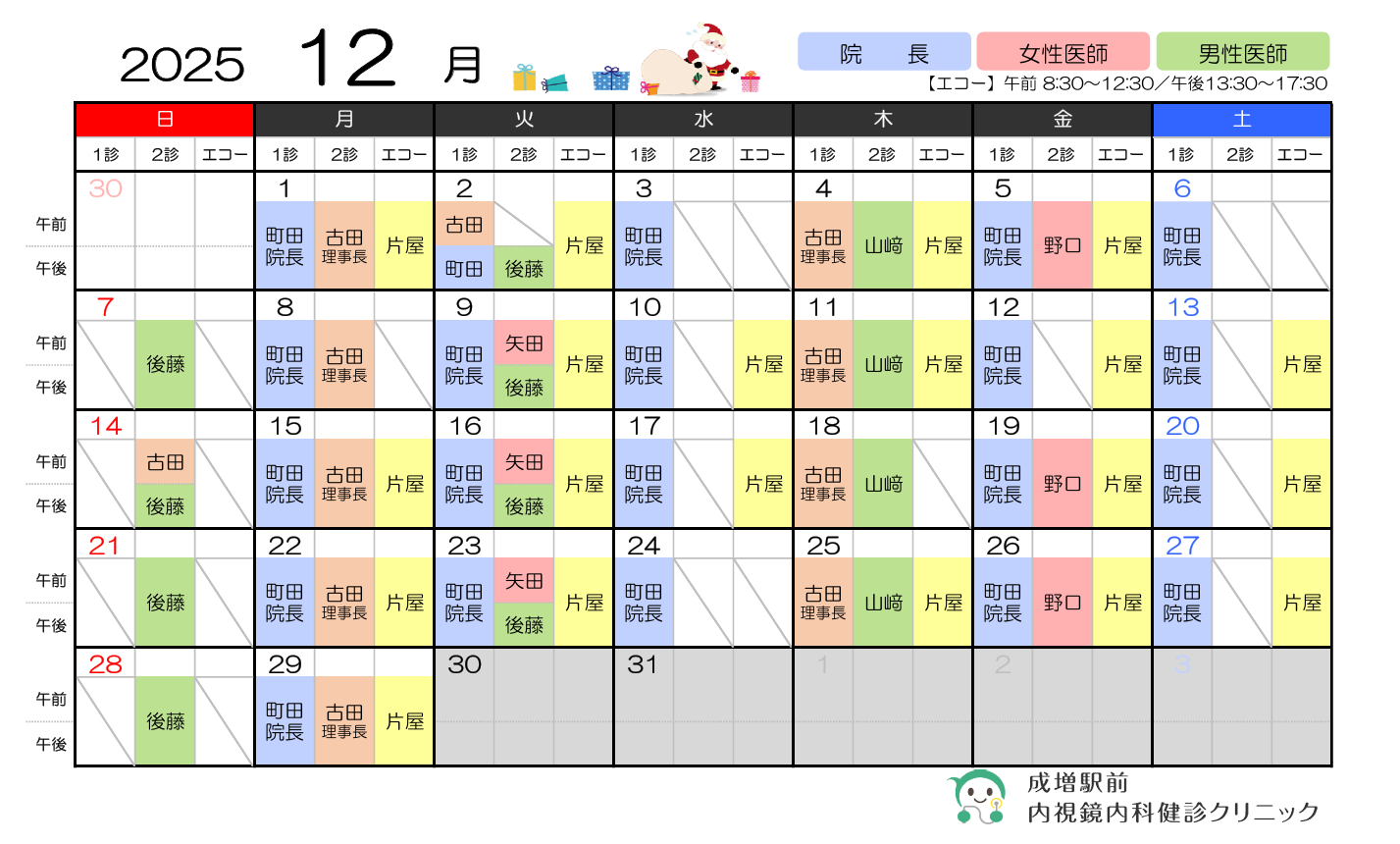 2025年11月の医師の勤務日、エコー実施日は次の通りです。