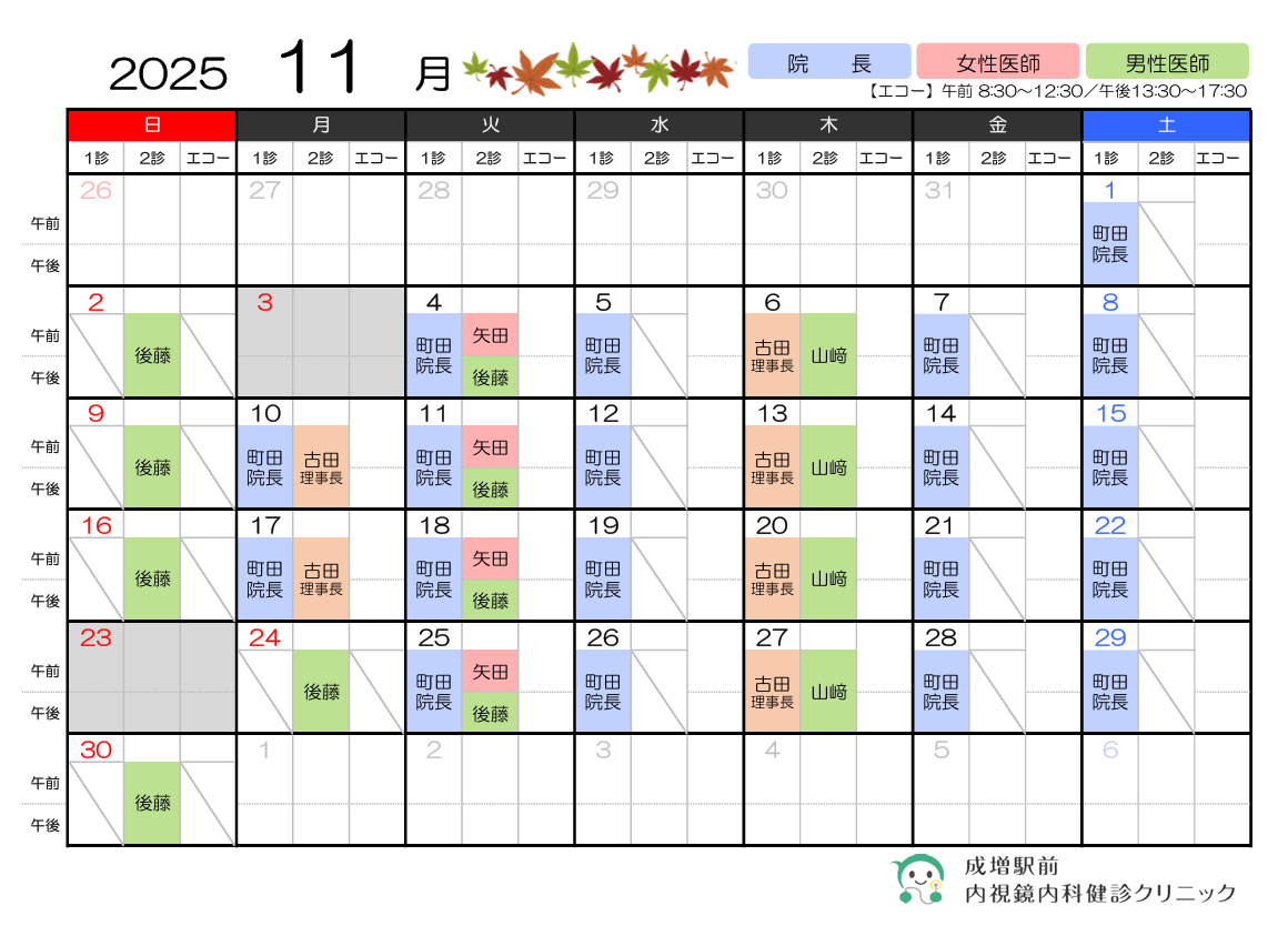2025年11月の医師の勤務日は下表のとおりです、エコー実施日は決定次第お知らせいたします。