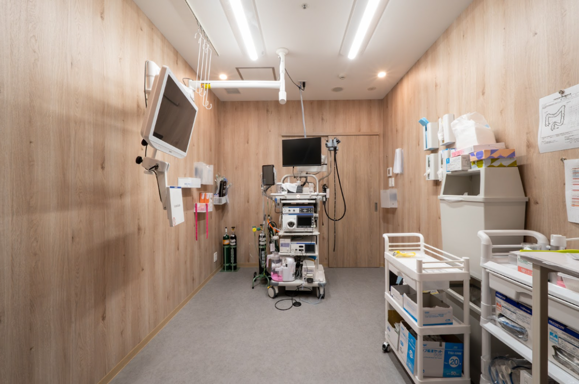 成増駅から徒歩すぐの、当院の内視鏡室です。木目調の壁紙は温かみがあって、病院特有の緊張感を和らげてくれます。